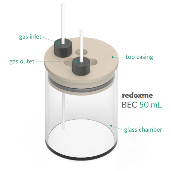 This is a stationary solution basic electrochemical (electrolytic) cell for measurements of electrodes in a form of: a) rod/disc (6 mm dia.), b) thin film deposited on flat substrate (using a clip electrode) and c) membrane (using a clip electrode). The working, counter and reference electrodes are mounted in a top casing either in 2-, or 3-electrode setup. The cell elements are constructed with materials that are inert to the sample (glass and PEEK). It well fits aqueous (EPDM O-Rings) and organic solvent (FFKM O-Rings) electrolyte requirements. The construction is gas-tight and can be used when the removal and exclusion of contaminants such as oxygen and water is required by bubbling of an inert gas through the electrolyte. See the assembly demonstration here. The cell chamber is available in several material variants here.