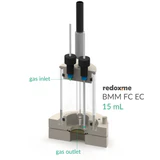 This is a static voltammetry cell with variants for different sample dimensions. The sample is loaded from the bottom via magnetic mount, while counter or/and reference electrodes are mounted in the lid as either 2-, or 3-electrode configuration. The cell is constructed with materials that are inert to the sample environment (glass and PEEK), and it can be used with FKM/EPDM O-rings or FFKM O-rings for aqueous or organic electrolyte requirements respectively. The construction is gas-tight and inert gas can be bubbled through the electrolyte to remove and exclude contaminants such as air or water.