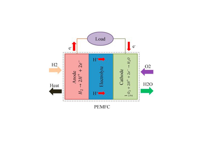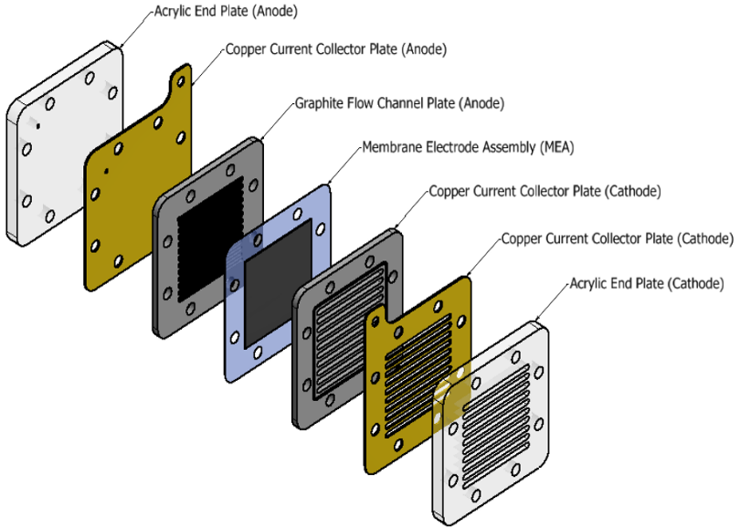 Fuel cells consist of two electrodes that conduct electrons – the anode and the cathode. The electrodes are coated with Pt/C catalyst layer and separated by an electrolyte (Nafion Membrane) that conducts ions (protons).