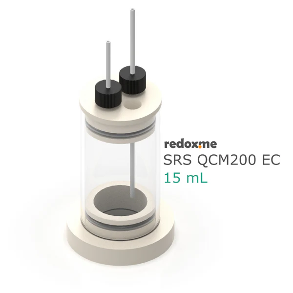 This is a stationary solution voltammetry cell for simultaneous measurements of electrochemical response and Quartz Crystal Microbalance sensing. This QCM EC module has been developed for a specific equipment supplied by Stanford Research Systems. It is compatible with QCM200 (5MHz QCM) system. In this configuration, a thin film of measured material is deposited directly on top of the QCM sensor. The QCM EC cell is mounted on Crystal Holder head, while counter or/and reference electrodes are mounted in a top casing (either 2-, or 3-electrode setup). The cell elements are constructed with materials that are inert to the sample (glass and PEEK). It well fits aqueous (FKM O-Rings) and organic solvent (FFKM O-Rings) electrolyte requirements. The construction is gas-tight and can be used when the removal and exclusion of contaminants such as oxygen and water is required by bubbling of an inert gas through the electrolyte.