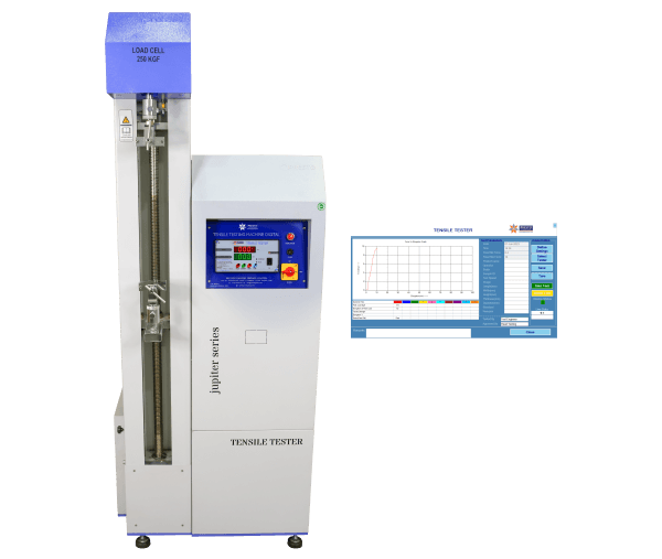 This digital cum computerized model of tensile strength tester comes with a digital display and computer display that makes it easy for manufacturers to conduct tensile strength tests on the materials. The machine operates by clamping the material sample in between two grips and then applying a tensile force to the sample until it breaks. The digital control system and Win-Test software measure the amount of force applied, as well as the elongation or deformation of the sample, allowing for the calculation of various mechanical properties.
